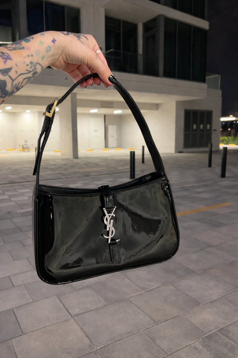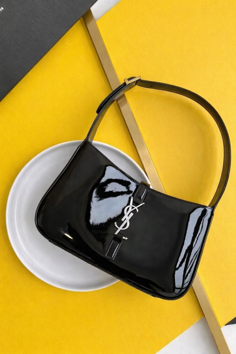 Ysl Hobo Patent Leather Black-Silver Top Zip Shoulder Bag With OriginalBox